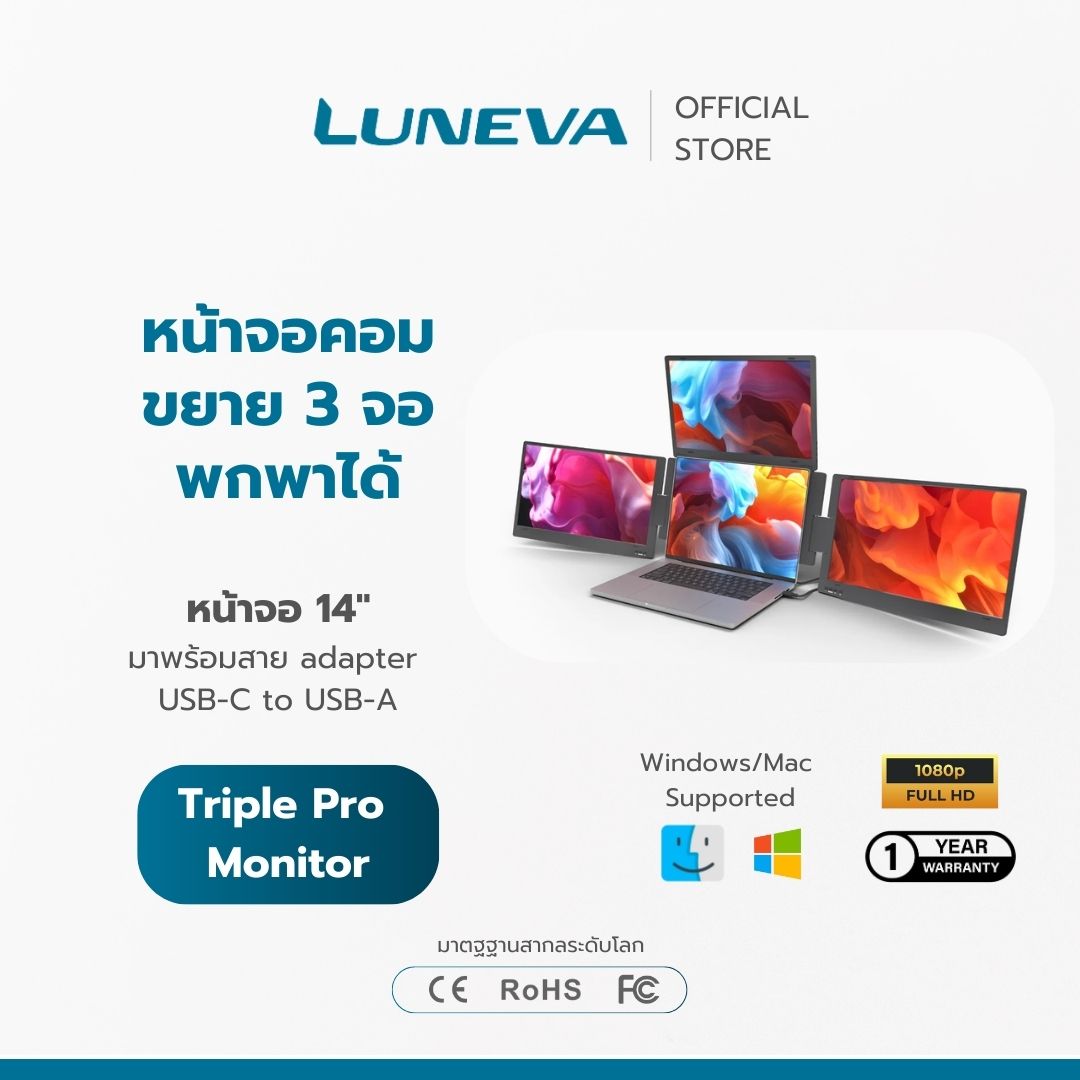 • LUNEVA Triple Pro Monitor LUNEVA Triple Pro Monitor - จอเสริมโน้ตบุ๊ก 3 จอ พกพาได้ 14 นิ้ว ใช้ได้กับ Mac/Windows จอพับได้ - Aluminium แข็งแรงเบา ฿18,990.00 Original price was: ฿18,990.00.฿15,990.00Current price is: ฿15,990.00.